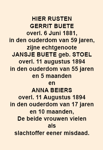 _ Heden, Dinsdag 9 October werd op onze begraafplaats het monument op het graf van mej. de Wed. BUETE en hare nicht ANNA BEIERS, geplaatst. Het geheel heeft een plechtig aanzien en maakt een goeden indruk. Het is een staand terracotta-kleurig beeldhouwwerk, waarin drie zwartmarmeren platen zijn aangebracht, waarin met vergulde letters staat gegrift: