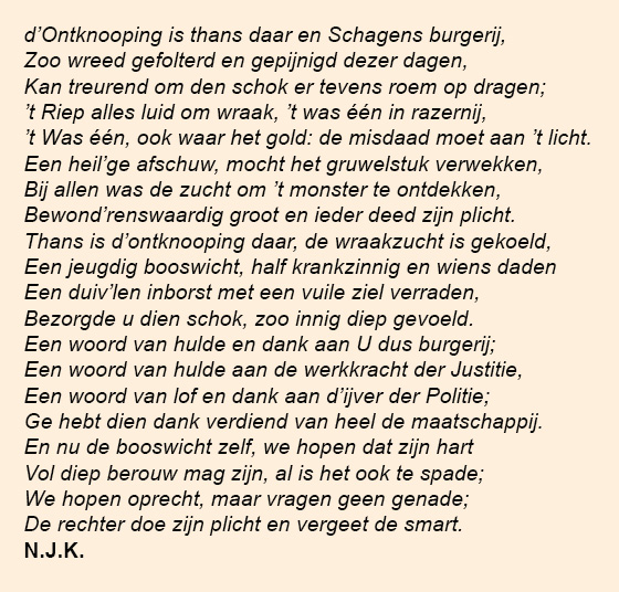 De heer S. Berman, voorz., verklaarde nu, zich gedrongen te gevoelen, een enkel woord te spreken naar aanleiding der vreeselijke dingen, welke onze anders zoo rustige gemeente in de laatste dagen in zoo groote beroering hebben gebracht. Oprecht en innig medelijdenmet de slachtoffers heeft onze ziel vervuld; met klimmende belangstelling heeft men het justitieel onderzoek gevolgd, en toen op donderdag l.l. bekend werd, wie het schandelijk feit zou hebben gepleegd, toen ontstond in de harten der ingezetenen rechtmatige blijdschap, maar ook heilige toorn. Goddank, dat zulke zenuwtrillingen in het menschelijke gemoed kunnen plaats vinden en dat de oogen nog de schaduwen van onrecht en onzedelijkheid opmerken, en men nog kan voelen, hoe diep de mensch zinkt, die zijn hart den scheid-brief gaf, – en dat het beleedigd rechts gevoel zich uitte zoolang die zware misdaad niet gestraft is. Dat de snoodaard is een Schager ingezeten, dat heeft ons allen ernstig gegriefd; niemand toch had gedacht, dat onze gemeente zulk een onverlaat kon herbergen. Voorwaar, het is een treurig feit. Gelukkig evenwel, dat de tweede verdachte onschuldig is bevonden aan het bloed dier vrouwen. Dat de schuld van den een en de onschuld van den ander aan het licht is gekomen, is vooral te danken aan het nauwkeurig onderzoek der Justitie. Met een ernst en een ijver, boven ieders lof verheven, deed Justitie dagen en nachten aaneen haar plicht. Hier past dan ook een woord van eerbiedige hulde en diep gevoelde erkentelijkheid aan den heer Mr. F.F. Karseboom, Officier van Justitie en aan den heer Mr. Lagerwey, Rechter-commissaris bij de Arr. Rechtbank te Alkmaar, voor de wijze, waarop zij Schagen aan zich hebben verplicht. Een woord van dank aan de Rechercheurs, de heeren Visser en Bedeke, der gemeentepolitie onze hoofdstad, – aan de Gemeentepolitie van Schagen, en aan de Majoors-brigadiers en verdere dienaren der Rijkspolitie voor de uitstekende wijze waarop zij gedurende zoo’n langen tijd hunne taak hebben verricht. Ik vertrouw dat de belangrijke diensten, door hen aan ons bewezen, weldra op de een of andere wijze zullen worden beloond. Tenslotte nog een woord tot U, leden van den raad dezer gemeente.