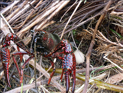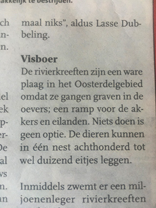 De heer Wouda vond namelijk een Amerikaanse rivierkreeft bereid om het eieren leggen even te staken om voor de fotograaf voor zijn nest te poseren. Dit beeld heeft mij wel overtuigd van het feit dat de kennis bij de Veldzorgbestuurders over het wel en wee van het Oosterdelgebied enorm groot is. Een goede keus van Staatsbosbeheer om hun eigendom te laten onderhouden door deze vakmensen. En dan te bedenken dat het Staatsbosbeheer bijna geen cent kost.