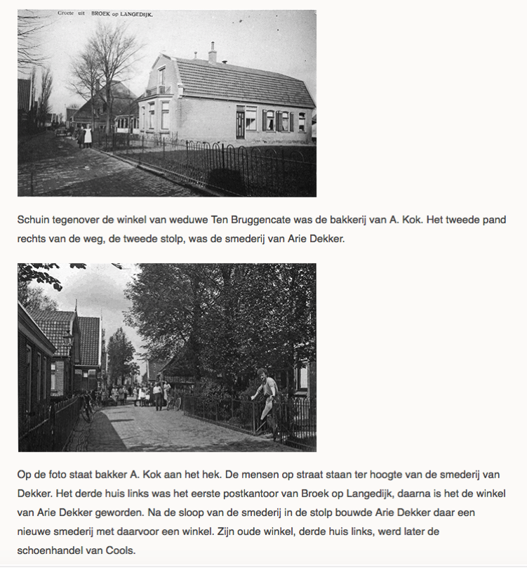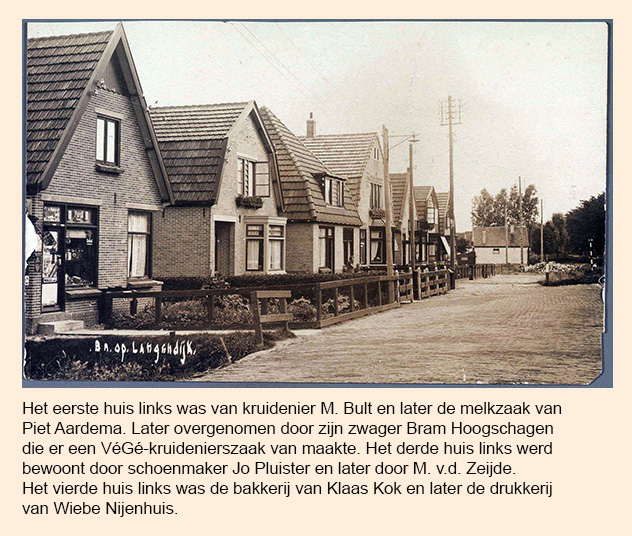 De bovenstaande illustratie van het Noordend van Broek op Langedijk komt uit deel 17 van de ‘Opkomst en ondergang van de middenstand in Broek op Langedijk’ eerder verschenen op deze site. Ondertussen werden er aan de zuidkant van Broek op Langedijk steeds meer woningen gebouwd. De Dijk raakte aan beide zijden bewoond en de Julianastraat en de Wilhelminastraat ontstonden. Op 31 mei 1928 trouwde Klaas Kok met Janna Nieuwenhuizen en betrokken zij een nieuwe bakkerij op de Dijk (op de foto het vierde huis links) in Broek op Langedijk. Of zijn vader zijn bakkerij op het Noordend heeft voortgezet is niet duidelijk. De vader van Klaas, Arie, overleed op 10 januari 1935.