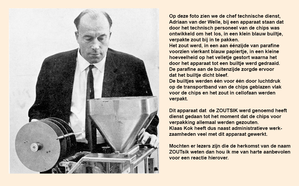 Arie Kok was, zoals hij dat zelf in een interview in de Chip Ahoy van 5 december 1967 noemde, een man van de praktijk; “Ik ben begonnen bij de N.V. Zuiderdel in de aardappelwasserij en ben naar de Smiths overgestapt toen er door een klein ploegje mensen werd begonnen me de chipfabricage. Ik ben als het ware met het bedrijf meegegroeid, heb alle verbouwingen en uitbreidingen meegemaakt, de vergroting van het assortiment producten, de aanschaf van nieuwe machines enzovoort. Ik begon met het snijden van de aardappelen, het klaarmaken van de mesjes en het bakken van de chips. Vervolgens werd ik chef van een groepje mensen en weer later kreeg ik te maken met de bedrijfsadministratie en de planning – waardoor ik niet rechtstreeks met de productie te maken had. Nu ben ik dus sinds ruim anderhalf jaar weer terug bij de productie. Niet alleen de administratieve kant, maar ook de technische kant van het vak heb ik in de praktijk geleerd, dankzij mijn samenwerking in de begintijd met de heer Van der Welle. Daardoor kreeg ik kijk op de machines, op het baksysteem en op het verpakkingssysteem. Het bakken was overigens niet helemaal nieuw voor me, want voordat ik in de aardappelwasserij belandde, was ik broodbakker in de zaak van mijn vader. Doordat zijn gezondheid verstek liet gaan en de bakkerij te zwaar was voor één man hebben we de zaak toen verkocht. Gelukkig is mijn vader zover opgeknapt dat hij ook weer werkt, net als ik eerst bij de N.V. Zuiderdel en nu bij Smiths. Hij voert de administratie van het huishoudmagazijn en daarnaast oefent hij op kleine schaal ook nog zijn oude beroep uit, want hij houdt zich ook bezig met het draaien van zoutjes.”
