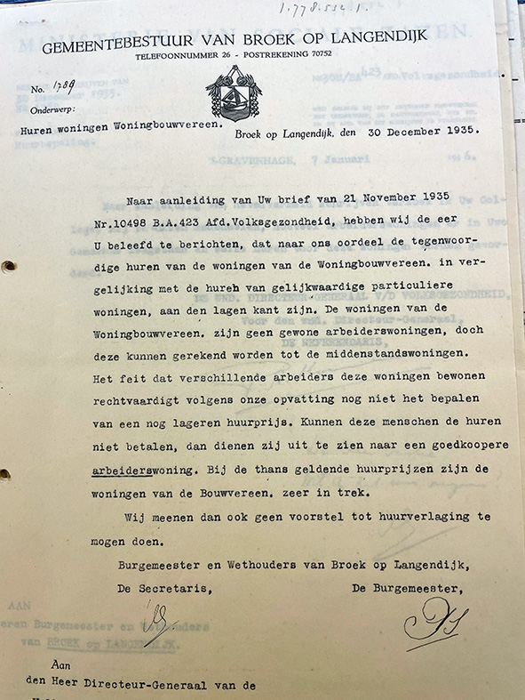 “Naar aanleiding van nevenvermeld schrijven deel ik Uw College, mede, dat de tegenwoordige huren de draagkracht van de huurders, die met inkomens van ƒ 27 tot ƒ 17,50 uitgezonderd, te boven gaan.