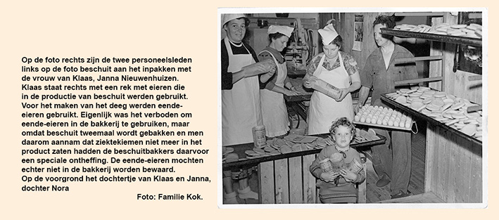 Naast brood en banket stond Klaas, net als zijn broer Paul, bekend om zijn beschuit. Het was een tijdrovende klus, want eerst moesten de beschuitbollen onder speciale beschuitblikjes worden gebakken, waarna ze doormidden werden gesneden om daarna nogmaals de oven in te gaan om tot de juiste kleur te bakken. Daarna werden de beschuiten handmatig in speciaal bedrukte zakken verpakt en waren zij klaar voor de verkoop. Dat waren niet alleen de klanten, maar er werd ook aan wederverkopers en kruideniers in de omgeving geleverd. Per week werd er ca. 400 rol beschuit uitgeleverd.