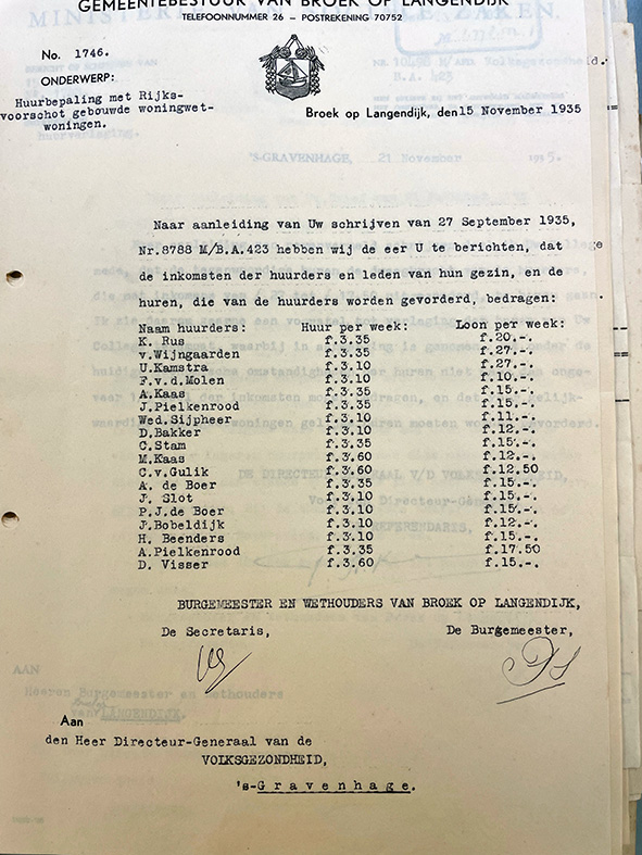 In de vorige aflevering heeft u kunnen lezen over de huurachterstand van bewoners in de Wilhelminastraat van Broek op Langedijk. Een jaar later, 27 september 1935, wil het ministerie van Sociale Zaken van de gemeente een opgave ontvangen van de inkomsten van de huurders en van hun gezin met een overzicht wat zij op dat moment aan huur betalen. Hieronder het overzicht dat de gemeente als antwoord op dit verzoek verstuurde.