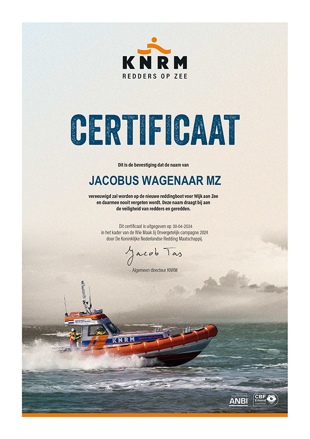 Binnenkort start de bouw van een nieuwe reddingboot voor reddingstation Wijk aan Zee en hieraan heeft de KNRM een heel bijzondere actie verbonden waar ik hier graag nader aandacht aan schenk. Op de nieuwe reddingboot hebben ze een plek gereserveerd voor 5000 extra namen, naast de bootnaam die wordt bepaald door de schenker van de boot. Het is bedoeld als een bijzonder en duurzaam eerbetoon aan mensen die geliefd en/of gemist worden. Als tegenprestatie vraagt de KNRM een eenmalige donatie van € 50,- per naam.